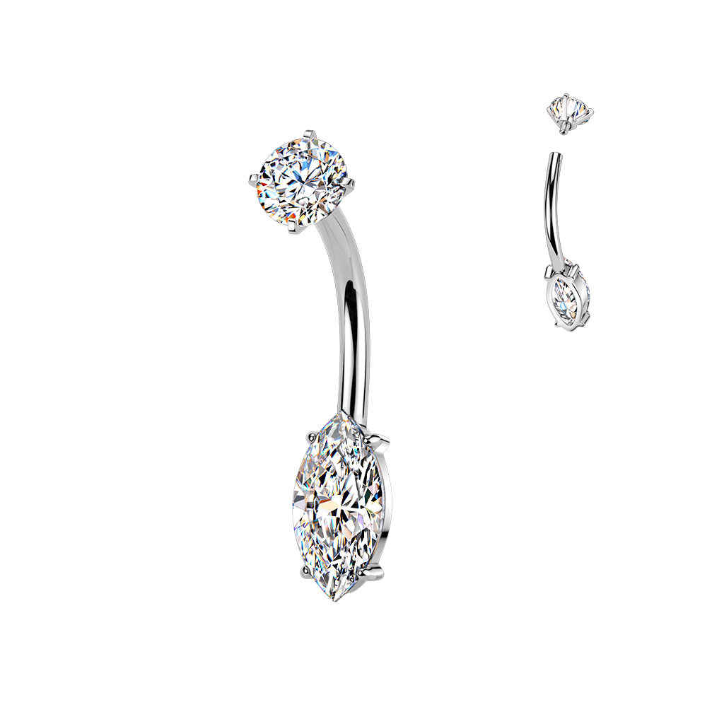 Made from high-quality 316L stainless steel, this internally threaded belly ring features a prong-set marquise-cut CZ that adds elegant sparkle, paired with a polished CZ top for balance and shine. Durable, waterproof, and tarnish resistant, it’s built for everyday wear without losing its glow.